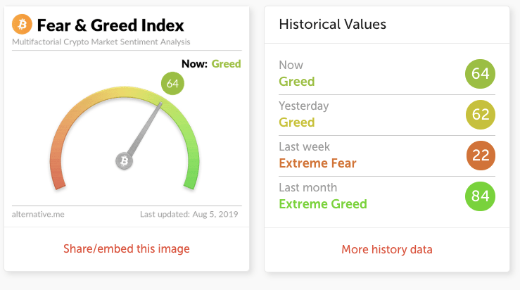 Chỉ số FOMO của thị trường đã quay trở lại mức cao trong những ngày gần đây lên mức 64 (mức tham lam) trong khi đó tuần trước giá bitcon ở 9k1$ thì chỉ số này ở mức 22 (rất sợ hãi)